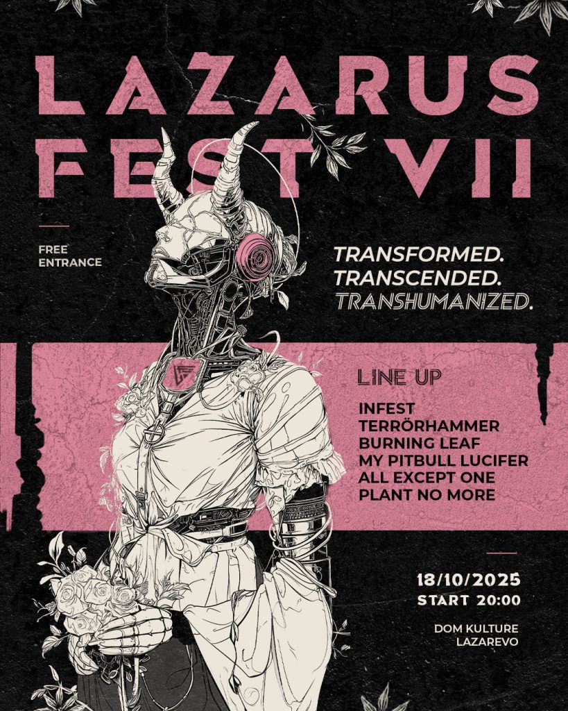The festival will take place in the village of Lazarevo, hosting the seventh Lazarus Fest, where this year’s lineup features: legendary Jagodina–Belgrade death/thrash metal aggressors Infest, Pančevo black/thrash/speed goat-worshippers Terrörhammer, Pirot stoner metal/rock pagans Burning Leaf, Pula psychedelic stoner doom worshippers of the unholy My Pitbull Lucifer, Novi Sad metal avant-gardists—the disciples of Mike Patton (aka neopattonists) Plant No More, and the last surviving shipwrecked sailors of Banat hardcore All Except One as local support. In addition, a brand-new music project from Lazarevo will make its public debut under the name Laser Move Kill.